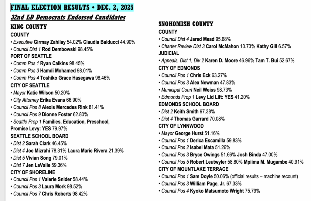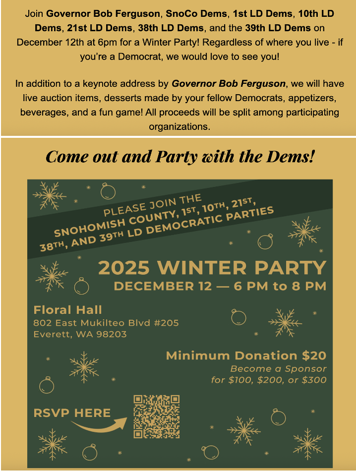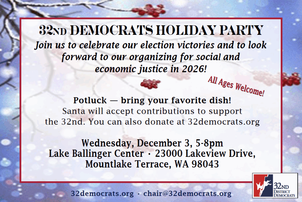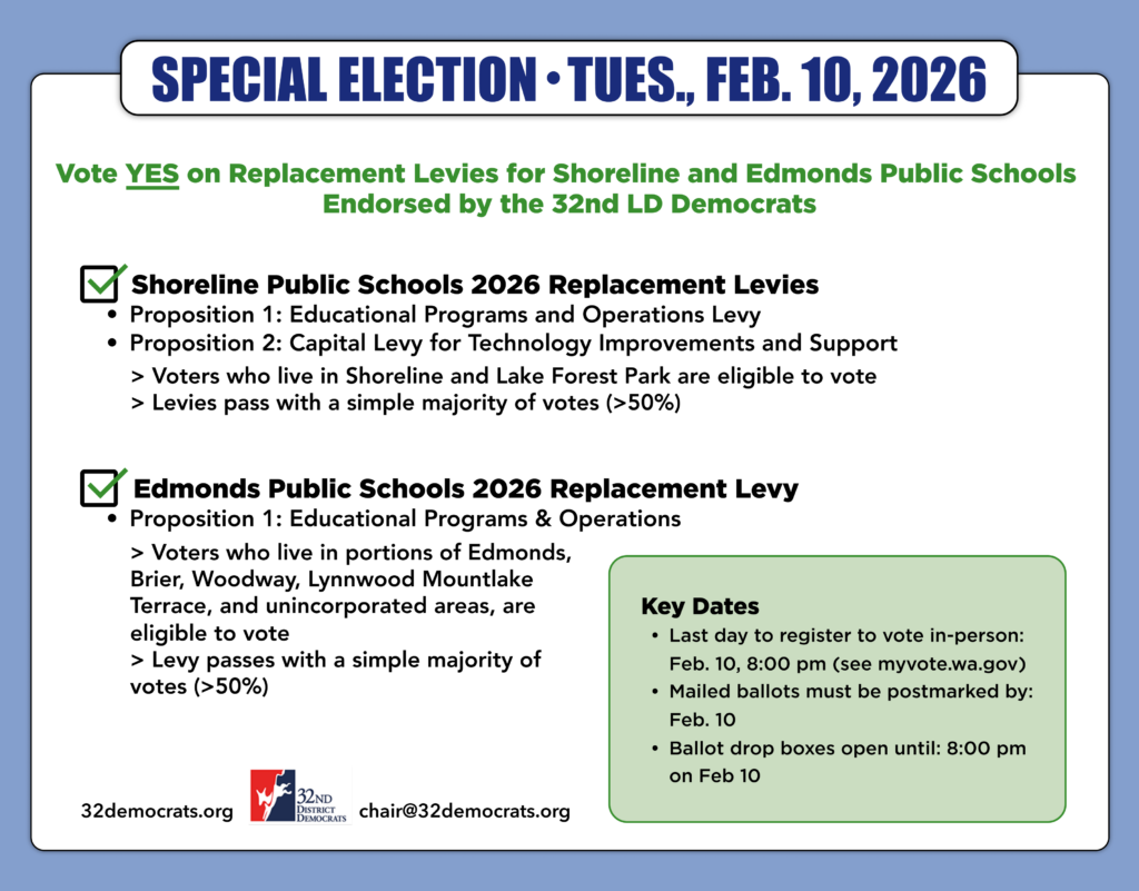 Our next meeting of our local Democratic Party will be Wednesday, February 4 at 6:30 pm on Zoom. Our agenda is below. We will be considering endorsements for the Shoreline replacement levies, Edmonds replacement levy, and King Conservation District (if candidates submit questionnaire).