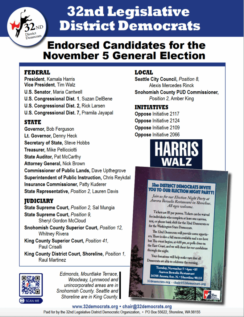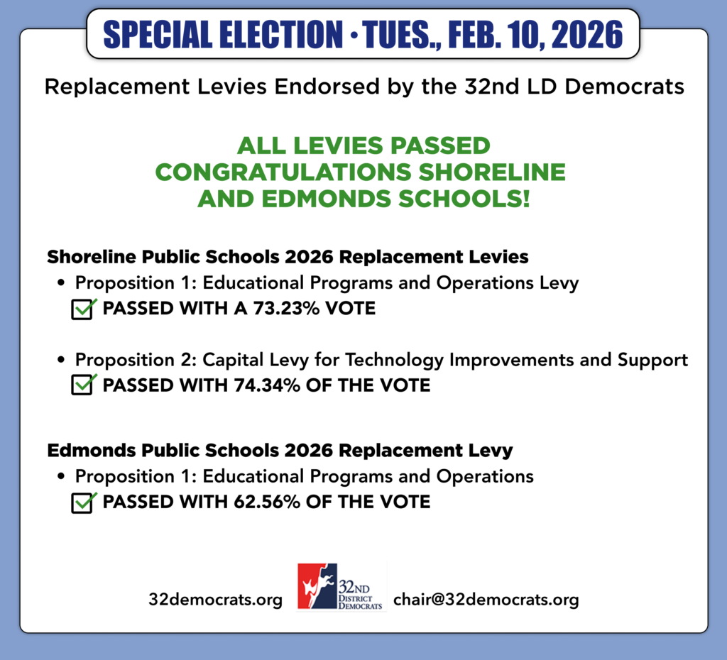 Today is the deadline to return your ballot. Voters all across the 32nd LD have elections today – for King County voters, an online ballot to elect supervisors to the King Conservation District. In Snohomish County, voters are voting on a school bond and a school operations levy.