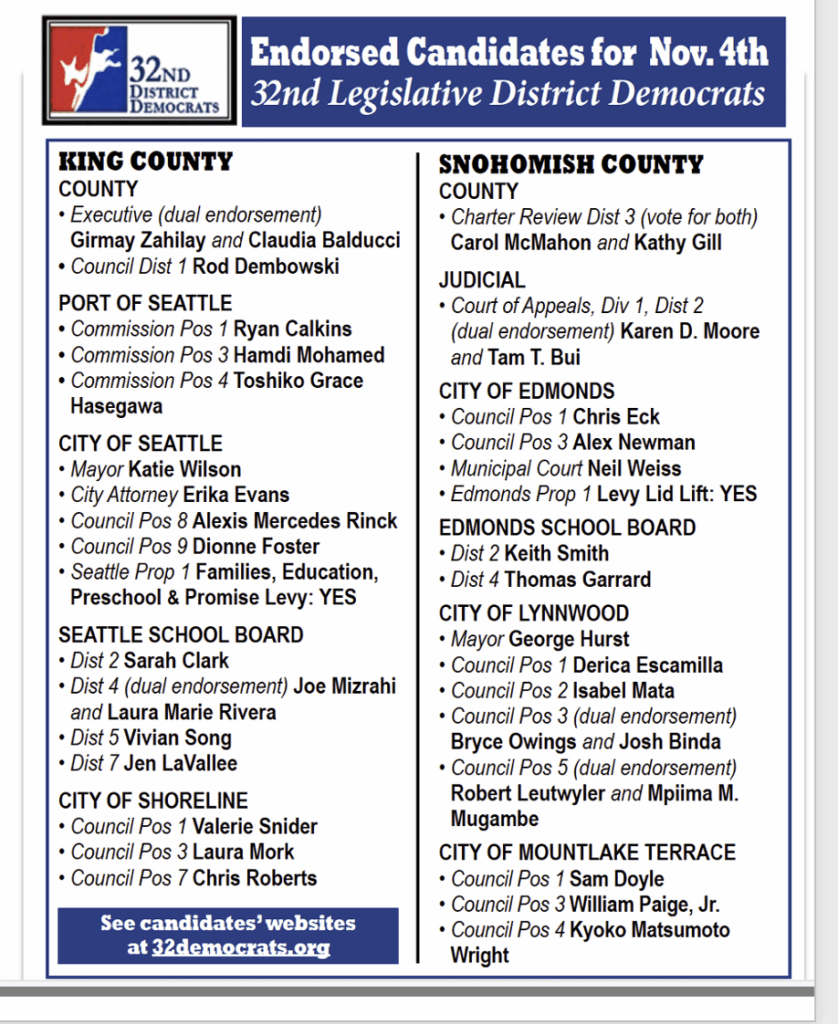 • Endorsements for Shoreline replacement levies, Edmonds replacement levy, King Conservation District (if candidates submit questionnaires)